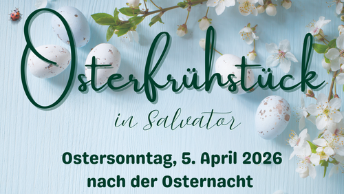 Am Ostersonntag sind alle herzlich eingeladen nach der Osternacht, um 5 Uhr, bei einem gemeinsamen Frühstück im Saal den Ostermorgen zu feiern. Dafür bringt bitte jeder einen Beitrag fürs Osterbüffet mit.