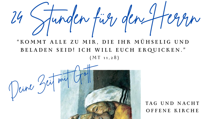 Diese Initiative lebt von der Teilnahme vieler Menschen, die sich zu unterschiedlichen Zeiten des Tages und der Nacht vor dem Allerheiligsten Sakrament versammeln. Begleitet wird „24 Stunden für den Herrn“ von einem vielfältigen geistlichen Programm sowie der Möglichkeit, das Sakrament der Versöhnung (Beichte) zu empfangen. Kommen Sie gerne dazu! In der Stille des Herzens wollen wir Gott anbeten, mit Ihm sprechen, auf Sein Wort hören, Ihn loben und Ihm unsere Anliegen anvertrauen.